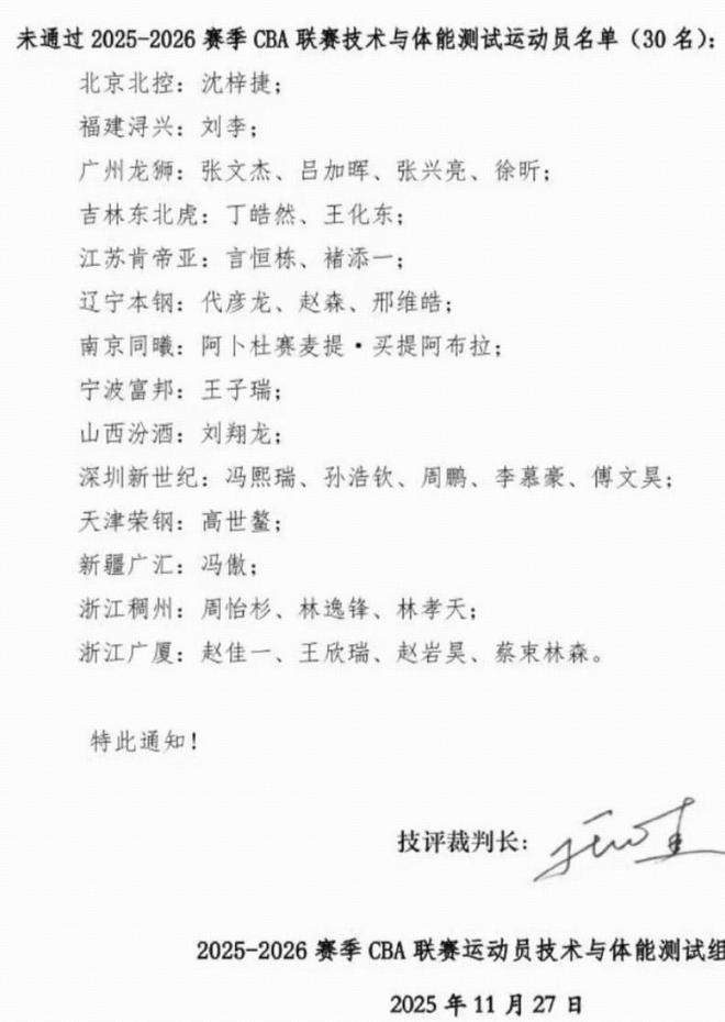 北京时间11月27日,CBA官方发布公告,本次CBA体测共有三十名运动员未通过,需要补测。